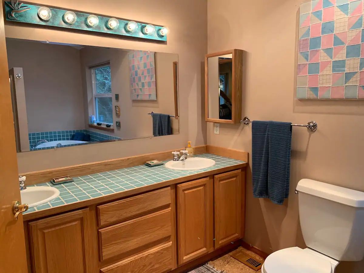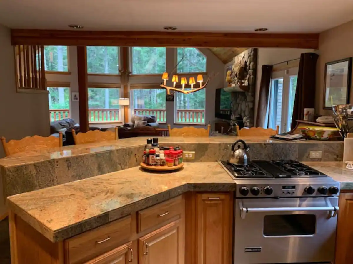 The nearest airport is Seattle-Tacoma International Airport, approximately 70 miles away. The chalet provides basic kitchen and bathroom essentials, but guests may want to bring their own toiletries and groceries. Restaurants and grocery stores are available in nearby towns like Enumclaw and Buckley, but bringing groceries from home may be more convenient. Area restaurants and shops such as Wapiti Outdoors, Naches Bar & Grill, and Greenwater Collective are only 4.5 miles away.