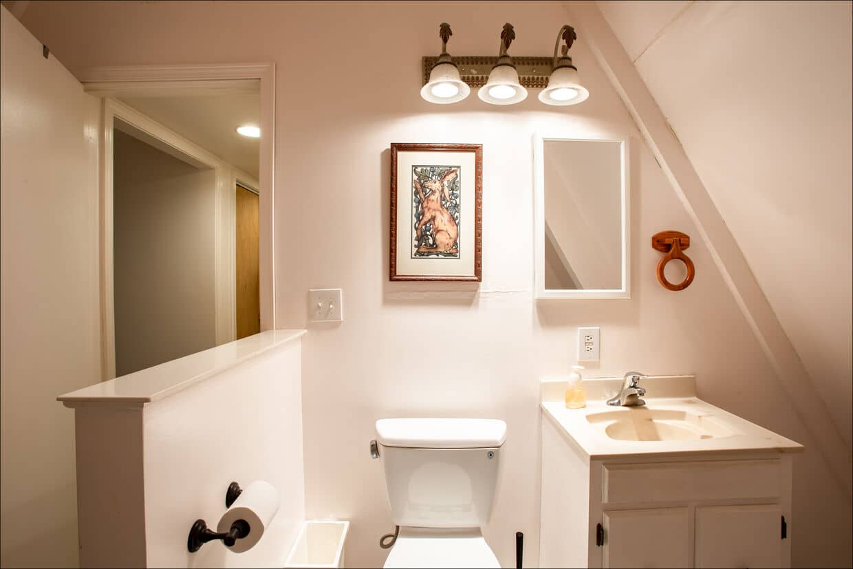 Crystal Moon Cabin is a 2-story A-frame vacation rental with 3-bedrooms and 2 and a half bathrooms