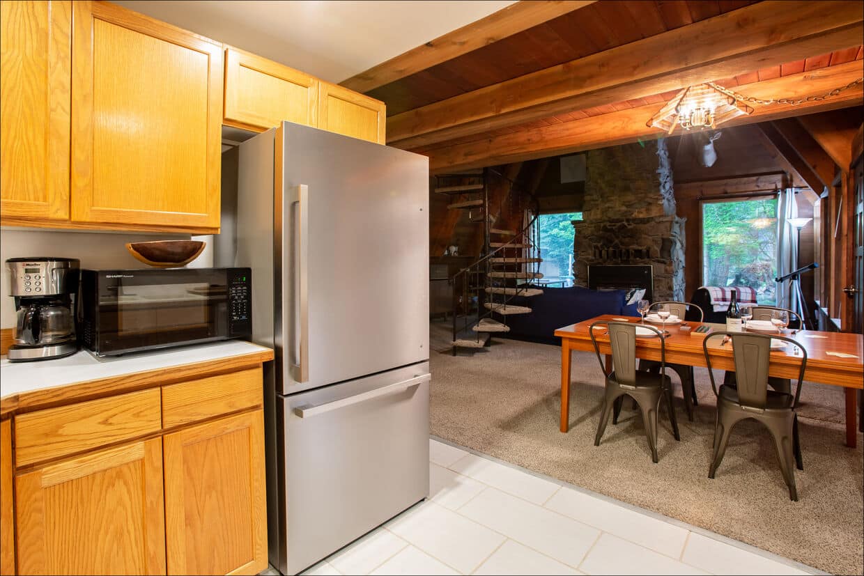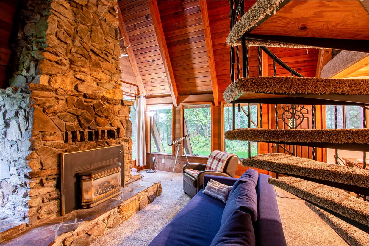 The spiral staircase, vaulted ceilings, exposed timbers, and massive stone fireplace offer a “wilderness retreat” ambiance. The main floor has space for guests to spread out in the kitchen, living room, family room, and dining area. The bedrooms and bathrooms are upstairs. The cabin has two full bathrooms and a third with a shower. Fresh linens and towels are provided. The two full bedrooms are supplemented with a bunk room, featuring two twin bunk beds, perfect for the kids. The rustic charm of the living room’s massive stone fireplace (propane powered) is especially nice in the evenings. In good weather, enjoy a morning coffee and an evening glass of wine on the deck while watching for wildlife. Deer and elk will wander past this remote property often.