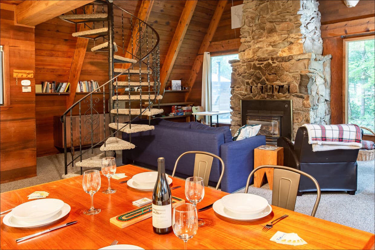 The grounds outside offer a picnic table and fire pit. Inside there’s a woodstove and fireplace. An assortment of board games and books are available. The usual occupancy is 6 people for the cabin, however, by using a futon and bunks can be stretched to 11.