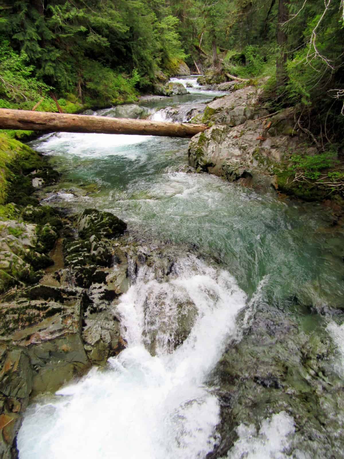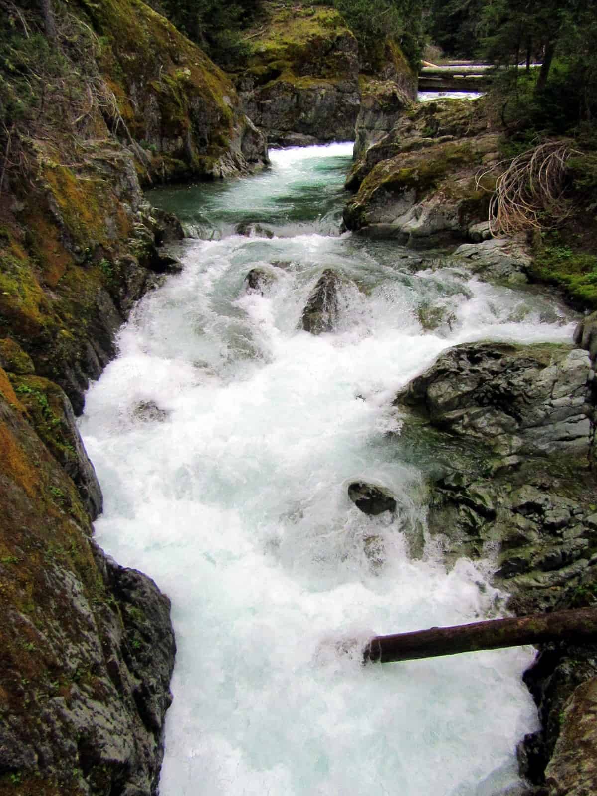At about 1.4 miles come to the next big attraction. Here the trail reaches a high bridge spanning Chinook Creek at a thundering chasm. From the bridge stare down at roiling and swirling waters in rocky potholes and flumes. Then continue hiking through the breathtaking primeval forest. At 1.8 miles keep your attention left so you don’t miss Stafford Falls. While only 25 feet tall, these falls roar. The plunge pool below is also stunning with its glacial blue tint.