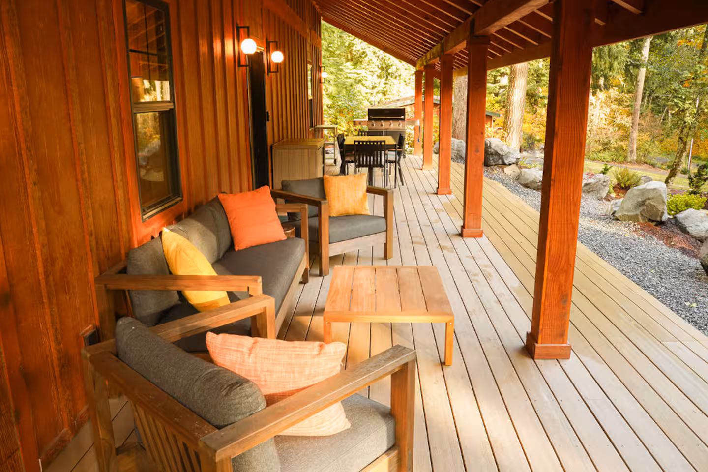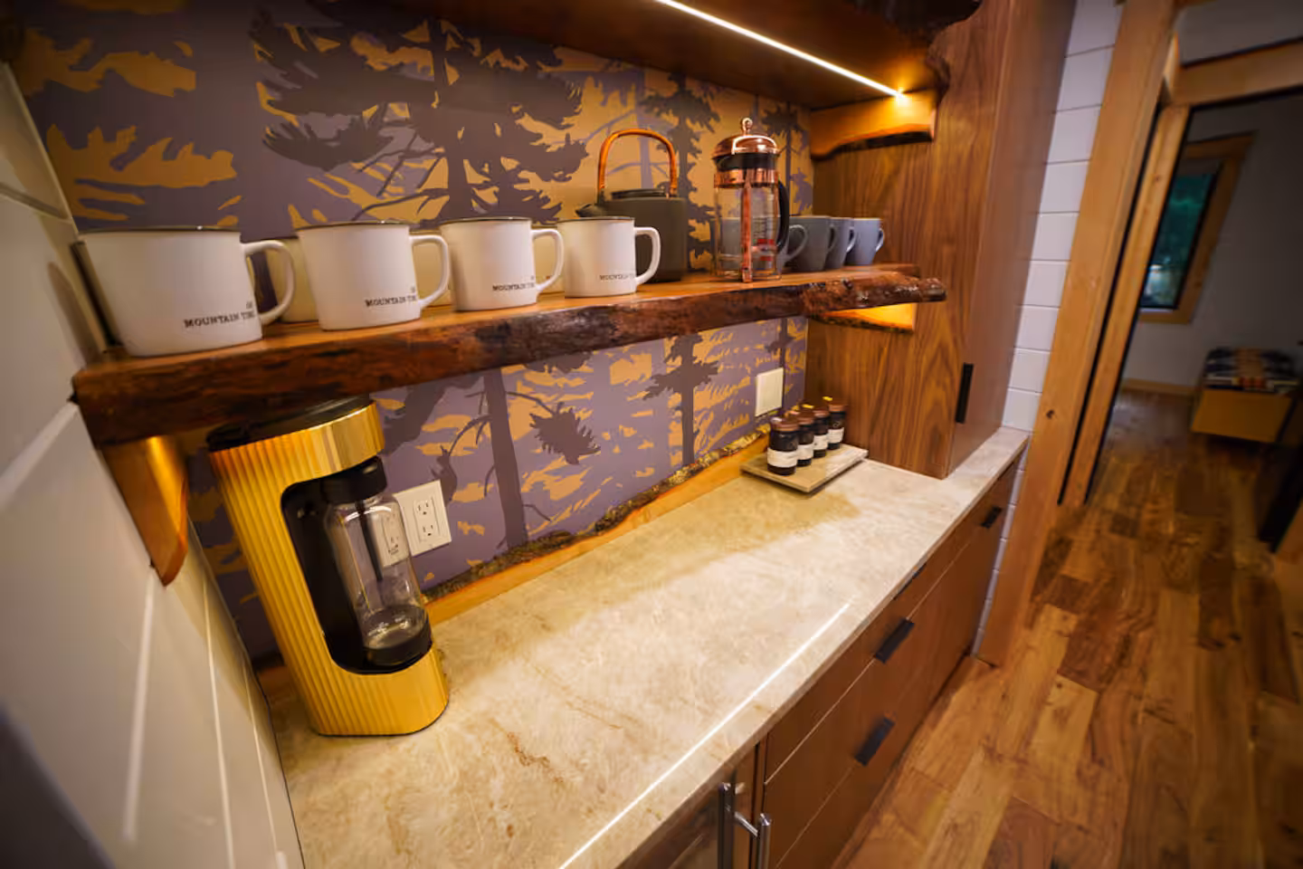 Just beyond the great room, a spacious outdoor deck extends the home’s living area with lounge seating, a dining table, and a gas grill. This space works well for quiet mornings, relaxed afternoons, or dinner under the trees. In addition, a dedicated coffee and tea station features local selections and encourages unhurried starts to the day.