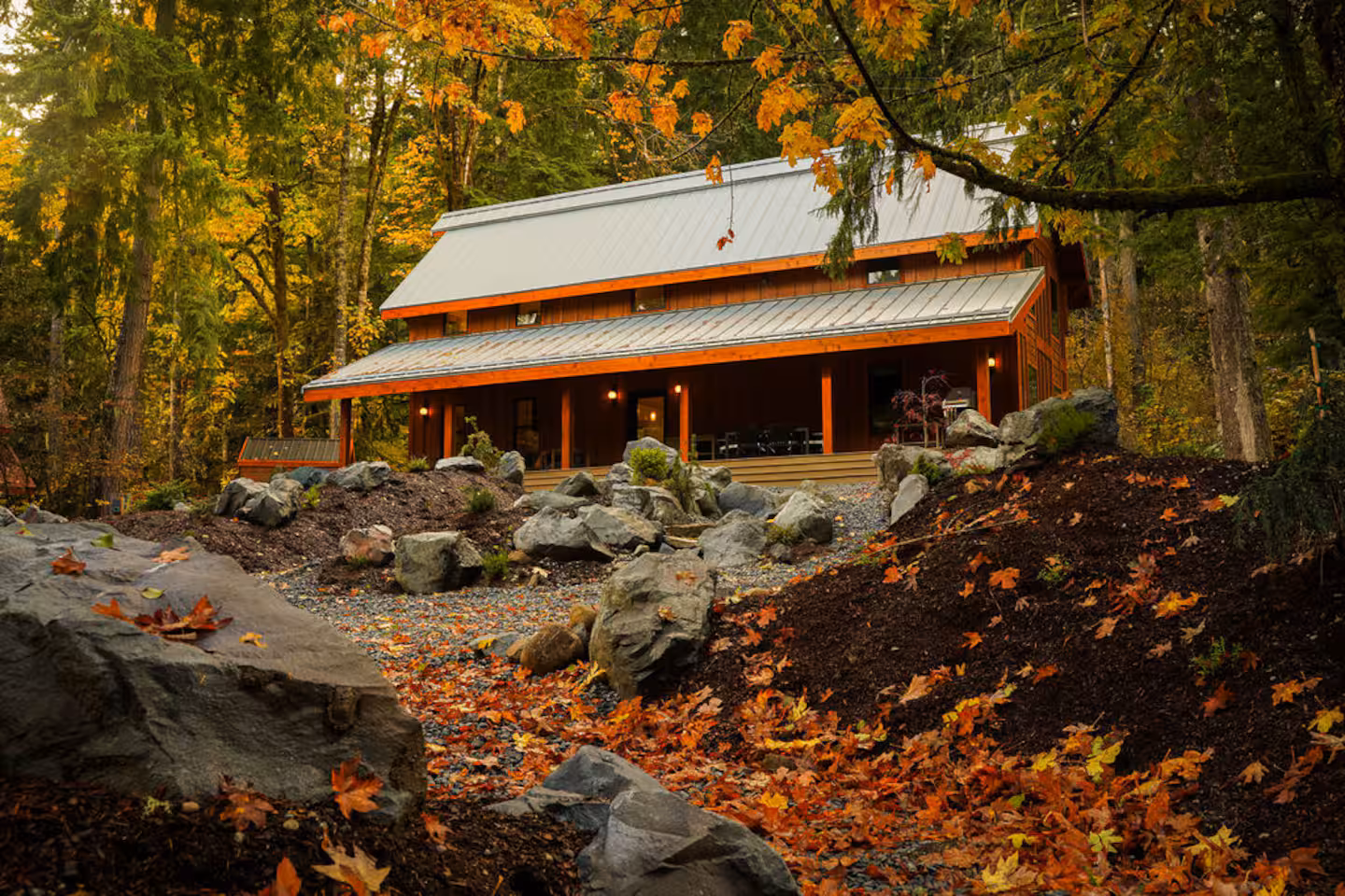 Fjellsangin is a refined retreat set in the forest near Ashford. This is new construction with custom finishes throughout. The architecture frames the trees and creates a quiet and elevated stay near Mount Rainier. The cabin sits a short drive from the Nisqually entrance and offers privacy, comfort, and thoughtful design in every room.