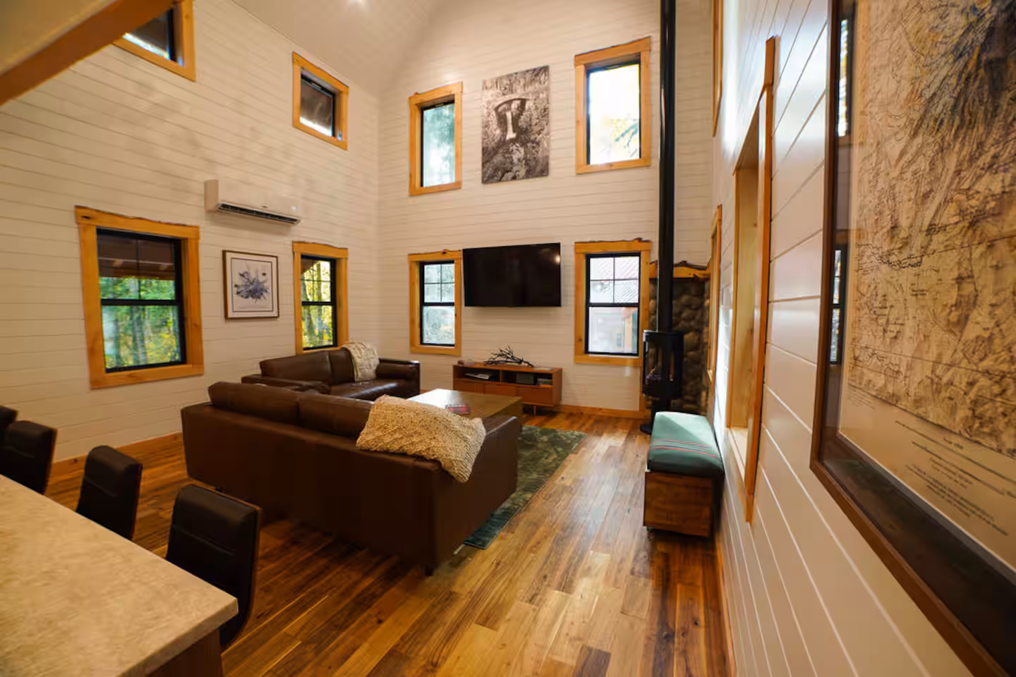 The main living area features clean lines, warm wood, and tall windows that open to the evergreens. A modern gas fireplace anchors the room and sets a calm tone after time outdoors. In addition, furnishings are chosen for quality and ease, with an emphasis on natural materials and function.