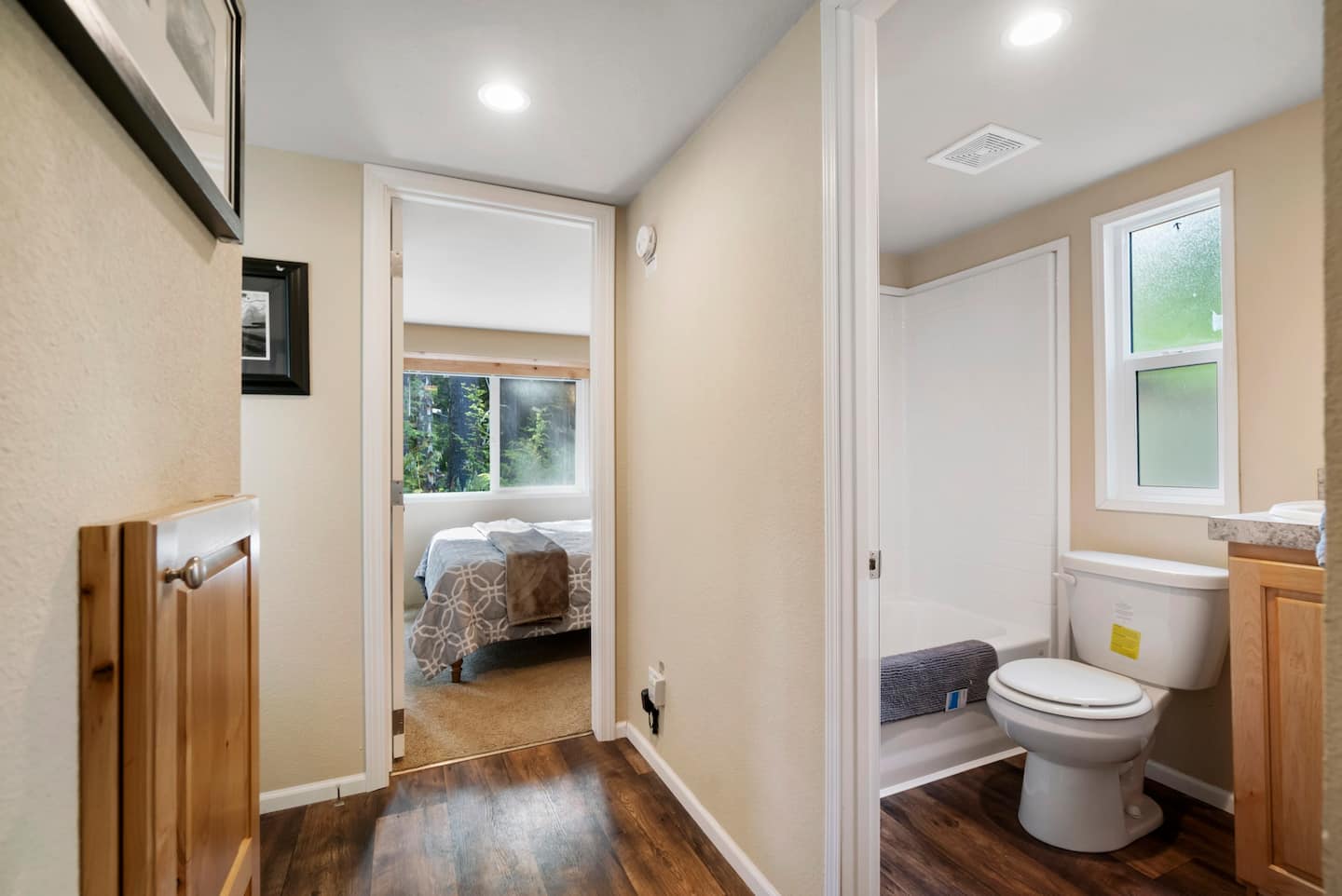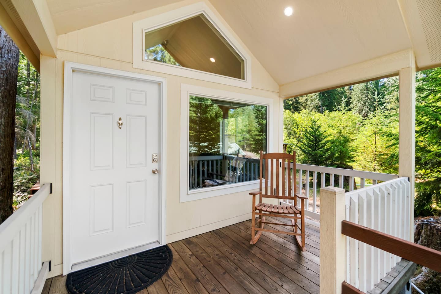 Goldilocks Cabin is nestled at the base of Mount Rainier. This tiny retreat offers thoughtful amenities packed into its 600 square feet. On arrival, guests first see an inviting covered porch. There’s a patio with outdoor games, a propane grill, and an outdoor dining area. Take in the breathtaking surroundings as you sit outside, sip a cup of coffee, and listen to the sounds of nature. As the sun sets, gather around the fire pit and roast marshmallows under the stars.