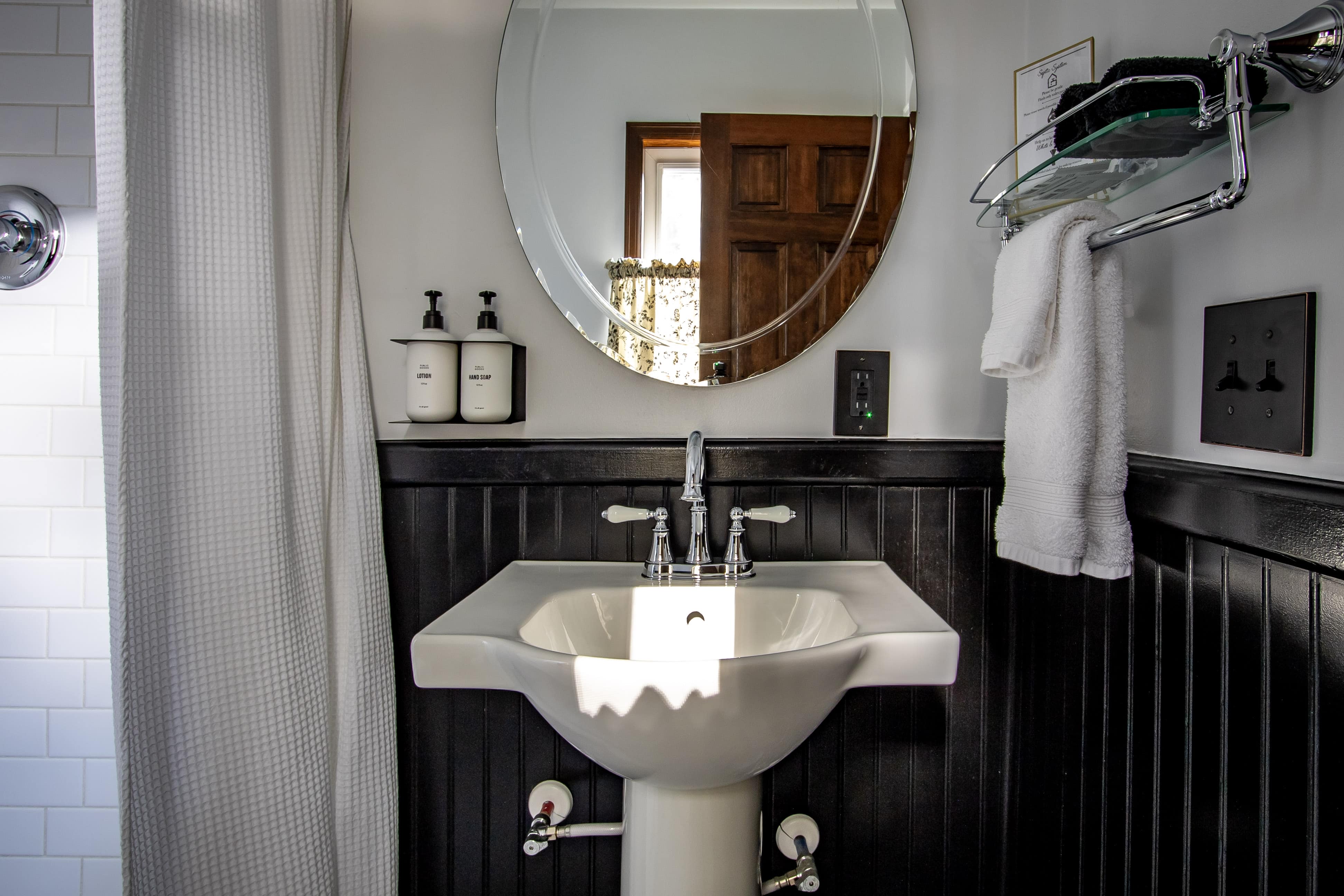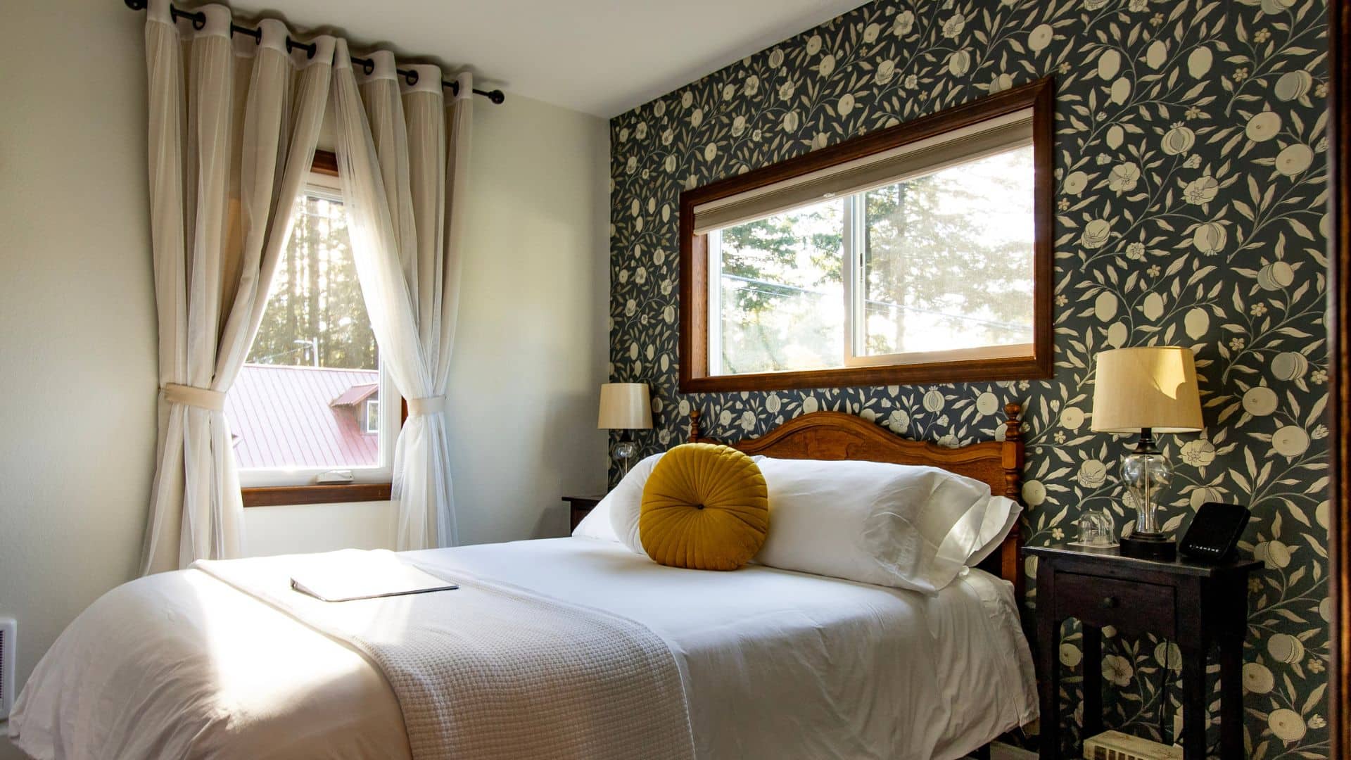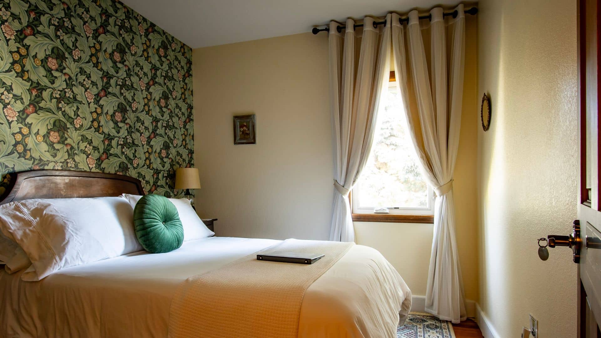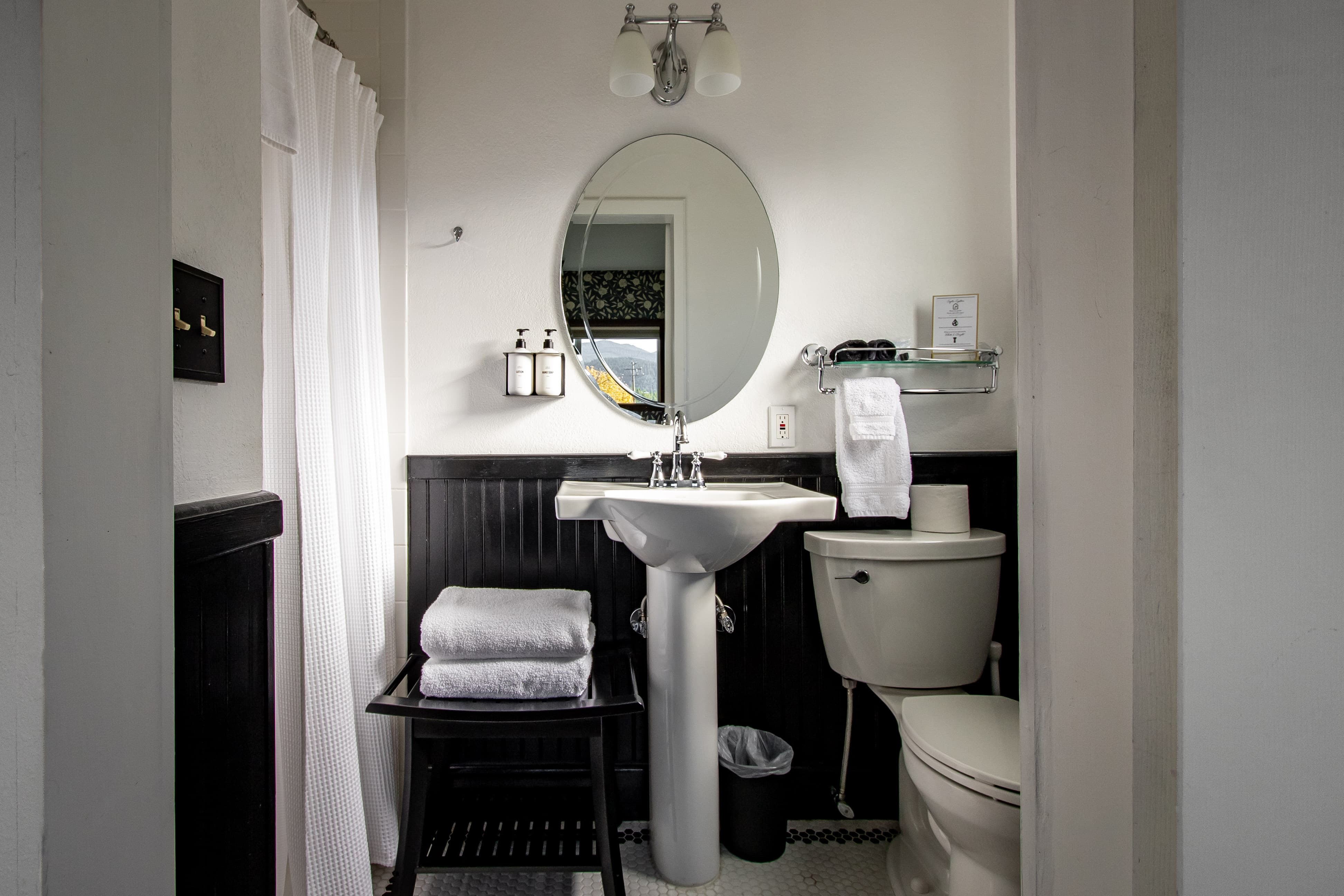 Guests can choose from nine unique rooms, each decorated with gorgeous William Morris wallpapers. Both light and dark hues of the designer wallpaper play well with natural light to provide an ambiance that drives home the point, this is no boring cookie-cutter hotel. Each room and suite is thoughtfully designed and named after a local hiking trail. Five guest rooms have private bathrooms with tiled showers. Four have access to two shared bathrooms and showers just a few steps down the second-floor hall. Each guest bathroom in the main hotel features iconic classic black and white hex tile floors and subway tile showers.