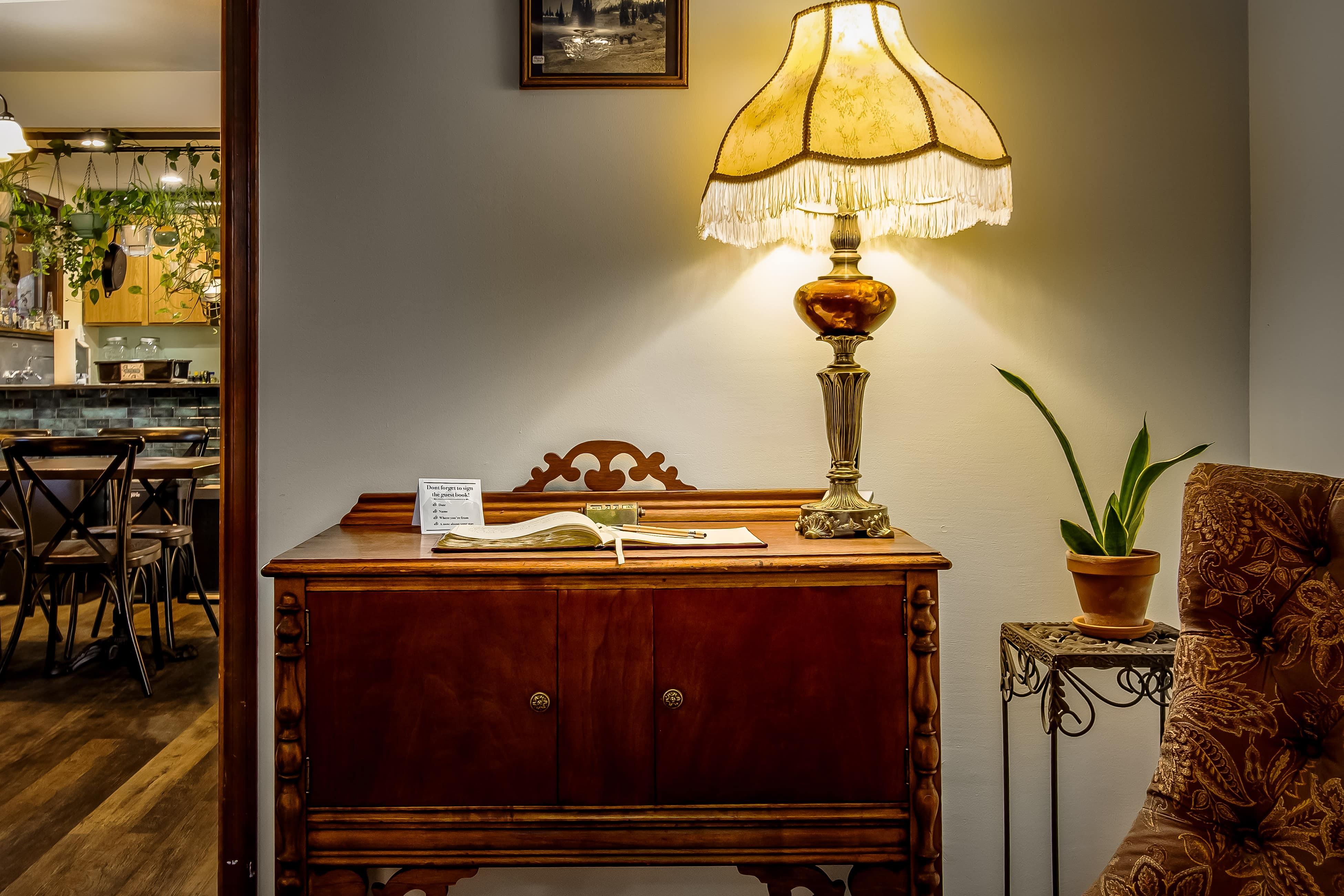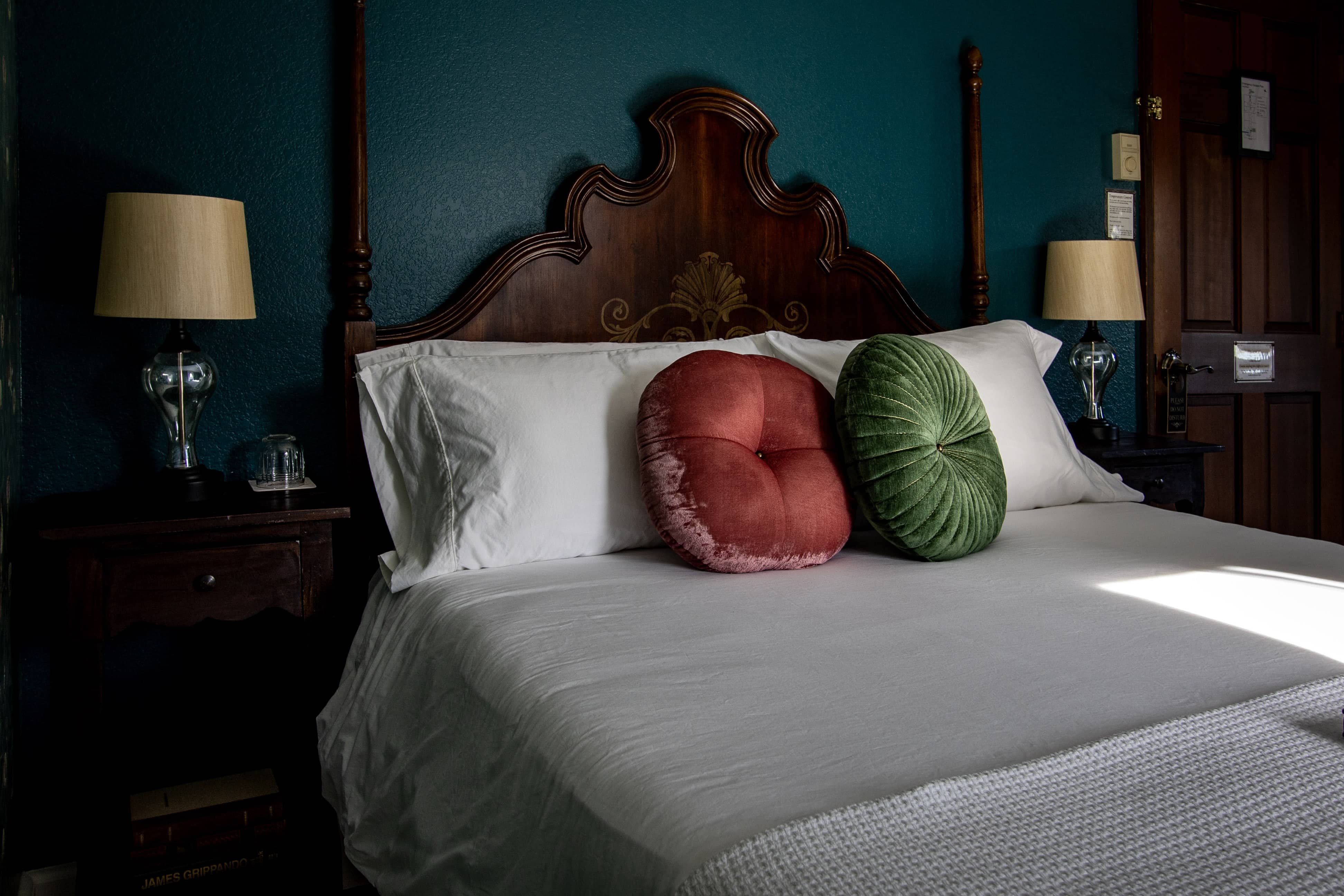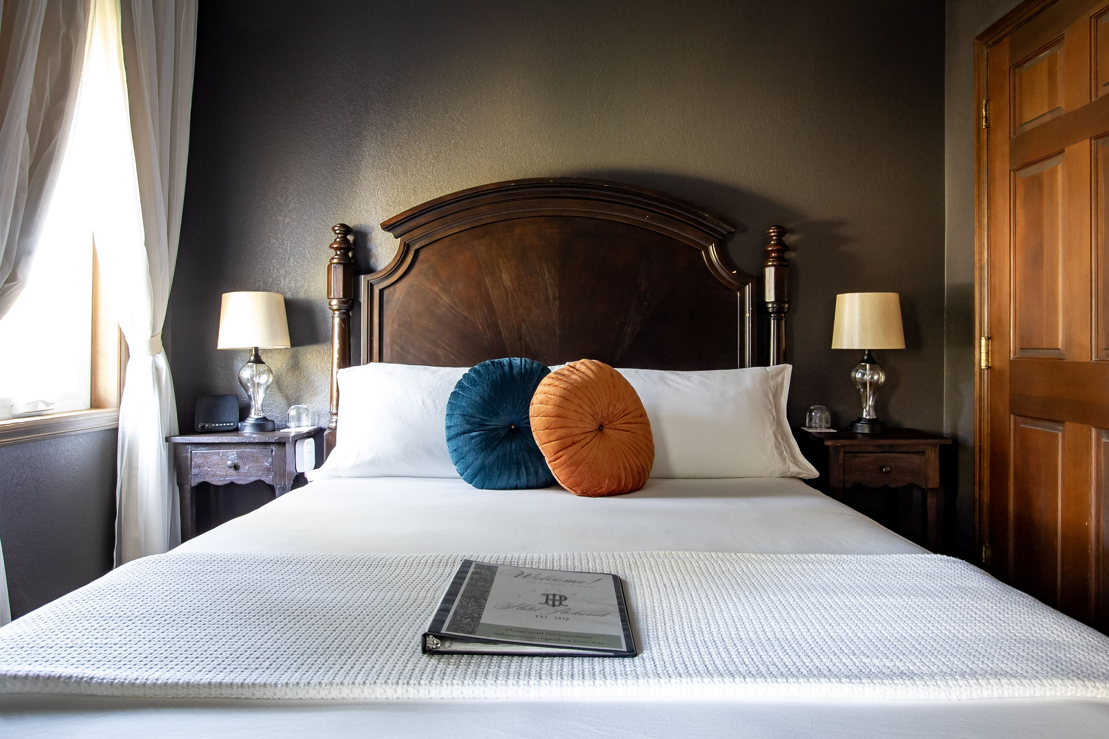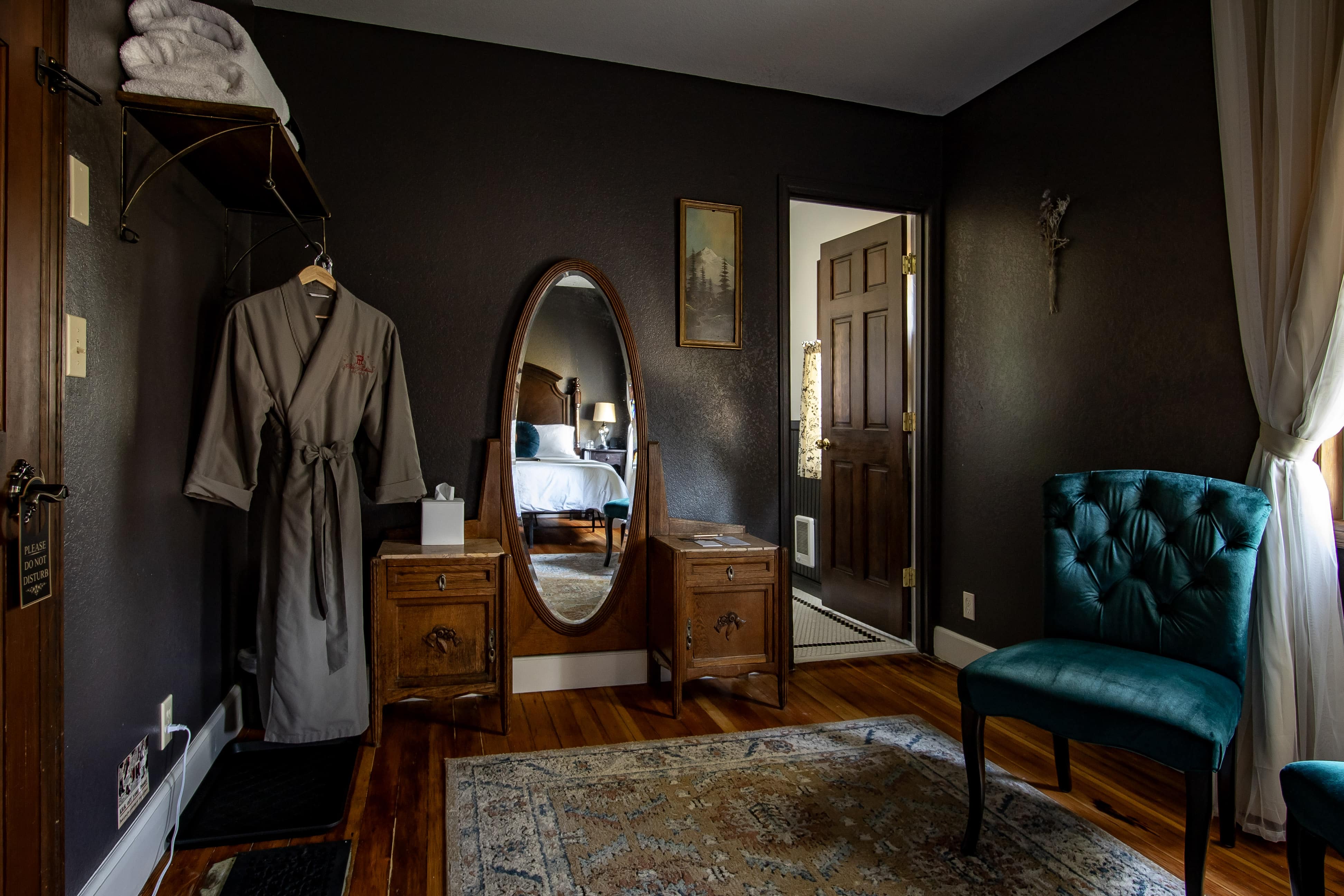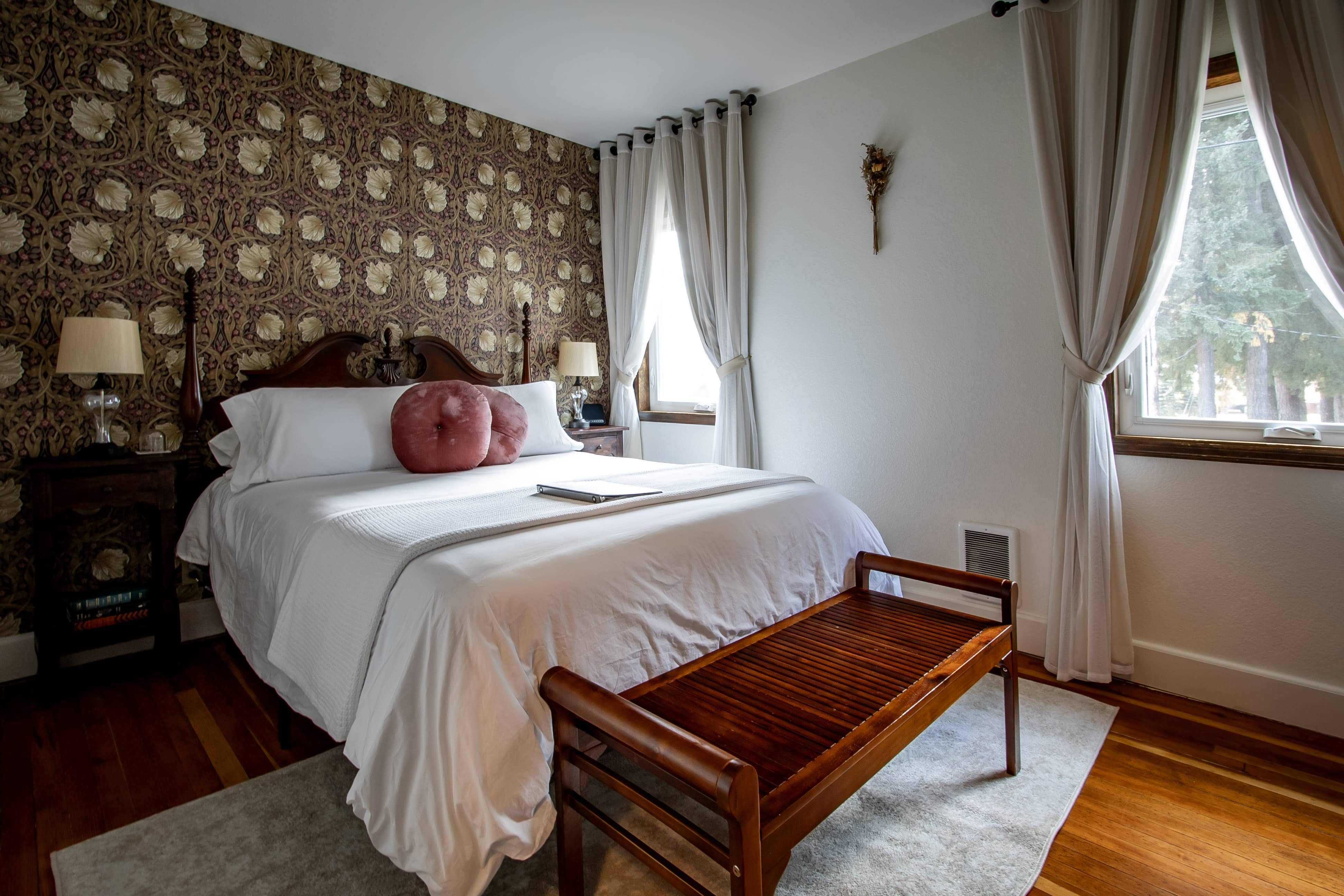 Guests can choose from nine unique rooms, each decorated with gorgeous William Morris wallpapers. Both light and dark hues of the designer wallpaper play well with natural light to provide an ambiance that drives home the point, this is no boring cookie-cutter hotel. Each room and suite is thoughtfully designed and named after a local hiking trail. Five guest rooms have private bathrooms with tiled showers. Four have access to two shared bathrooms and showers just a few steps down the second-floor hall. Each guest bathroom in the main hotel features iconic classic black and white hex tile floors and subway tile showers.