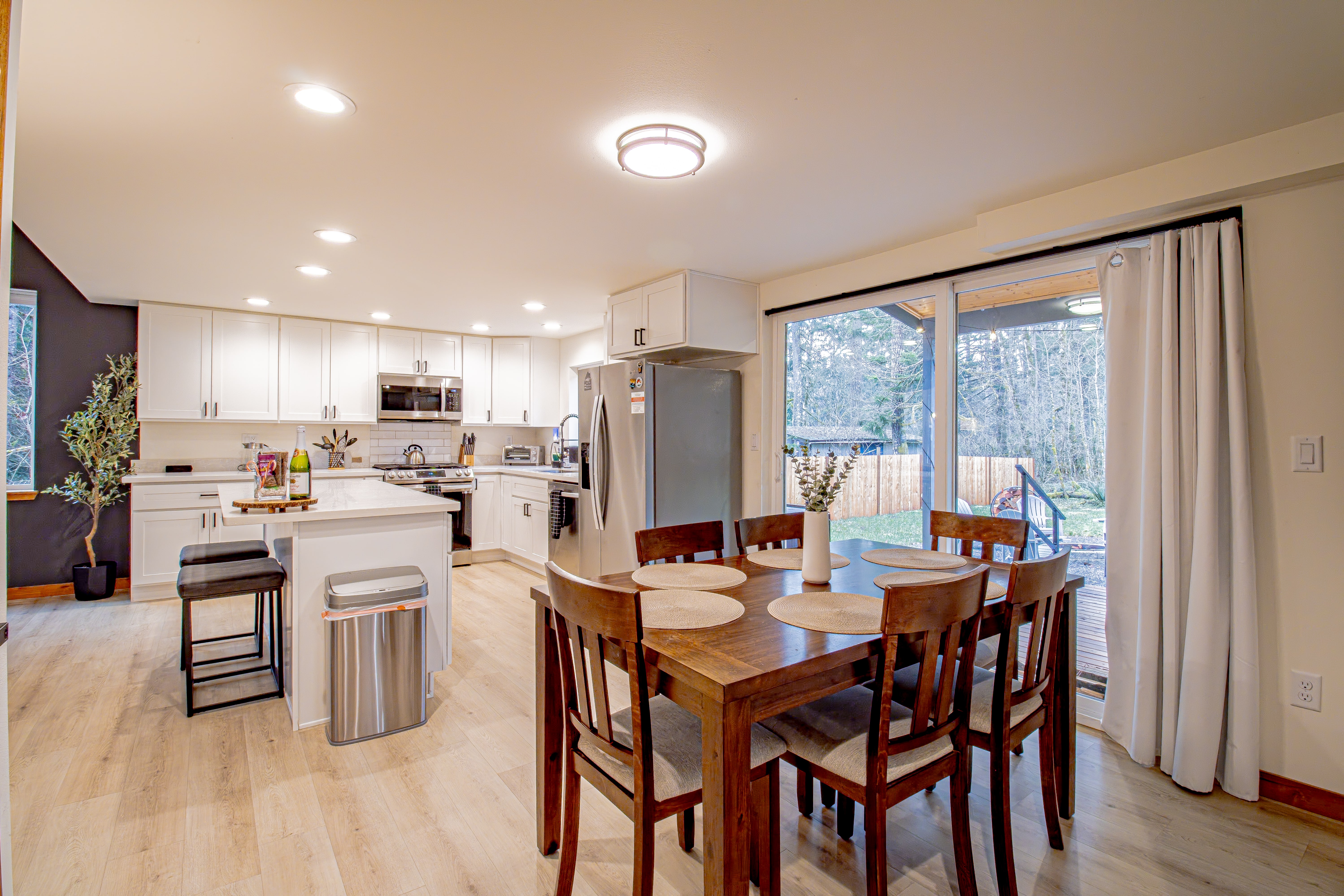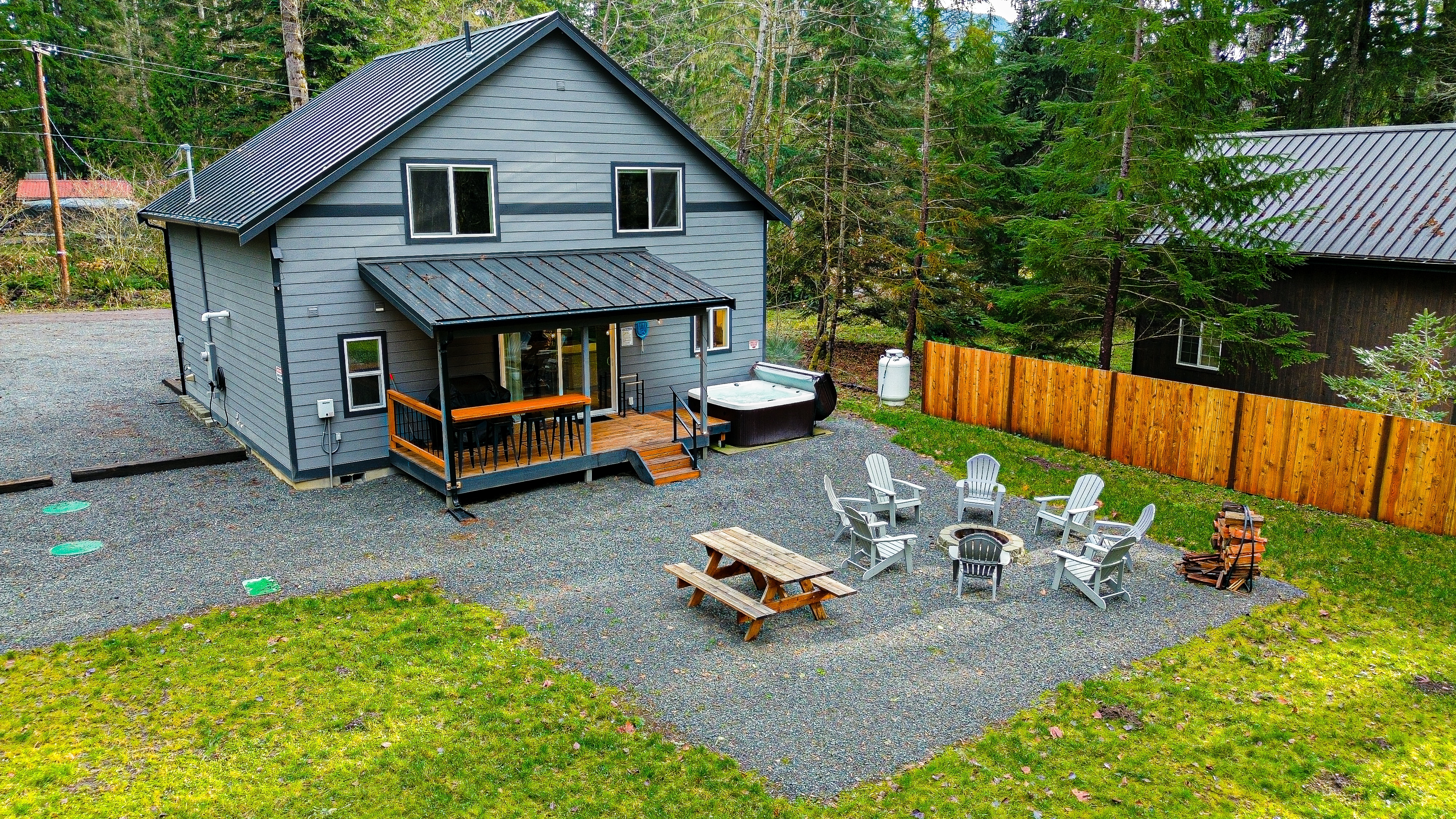 The spacious kitchen provides ample counter space for meal prep and serving, making it easy to whip up delicious home-cooked meals during your stay. If you fancy a night out, restaurants are just minutes away. After a day of exploring, unwind in the outdoor hot tub or gather around the fire pit under the stars.