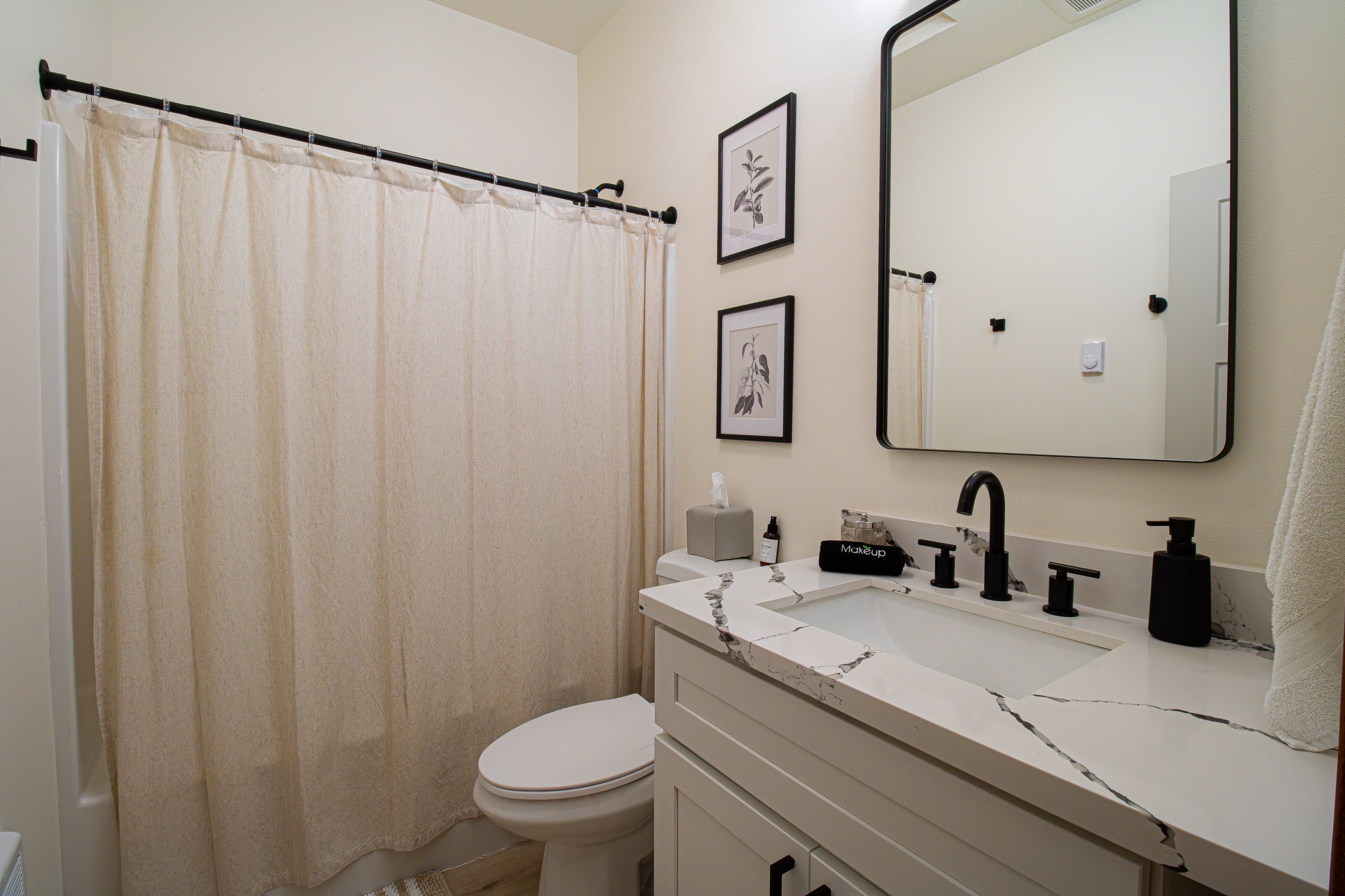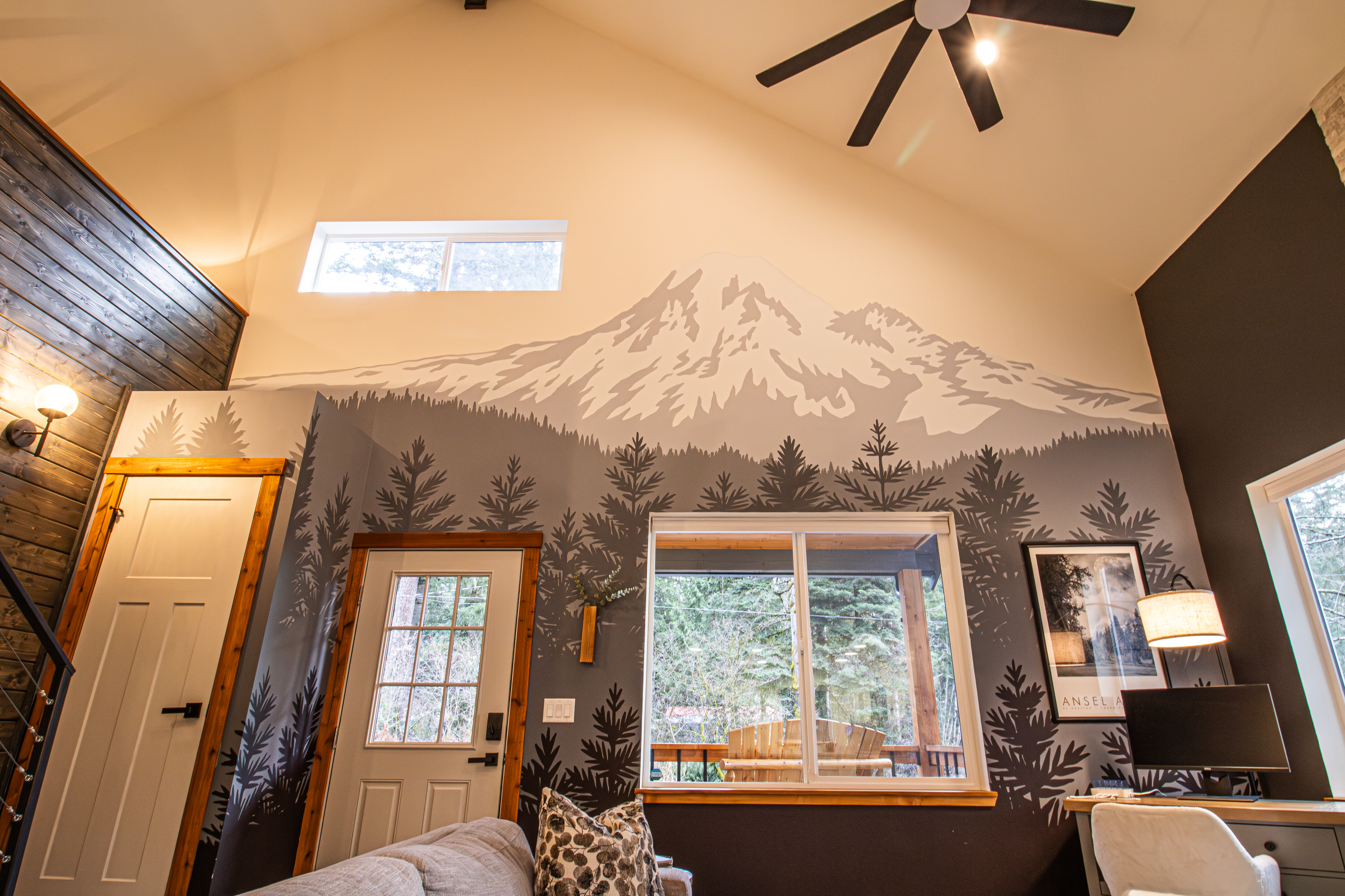 As you step inside, you’ll find vaulted ceilings in the living room adorned with a cozy fireplace and a beautiful mountain mural. The workstation offers internet access and a tranquil view of the forested grounds; perfect for a productive getaway. Upstairs, the loft features a fold-out futon, ideal for additional sleeping space, along with a guitar and kids’ games.