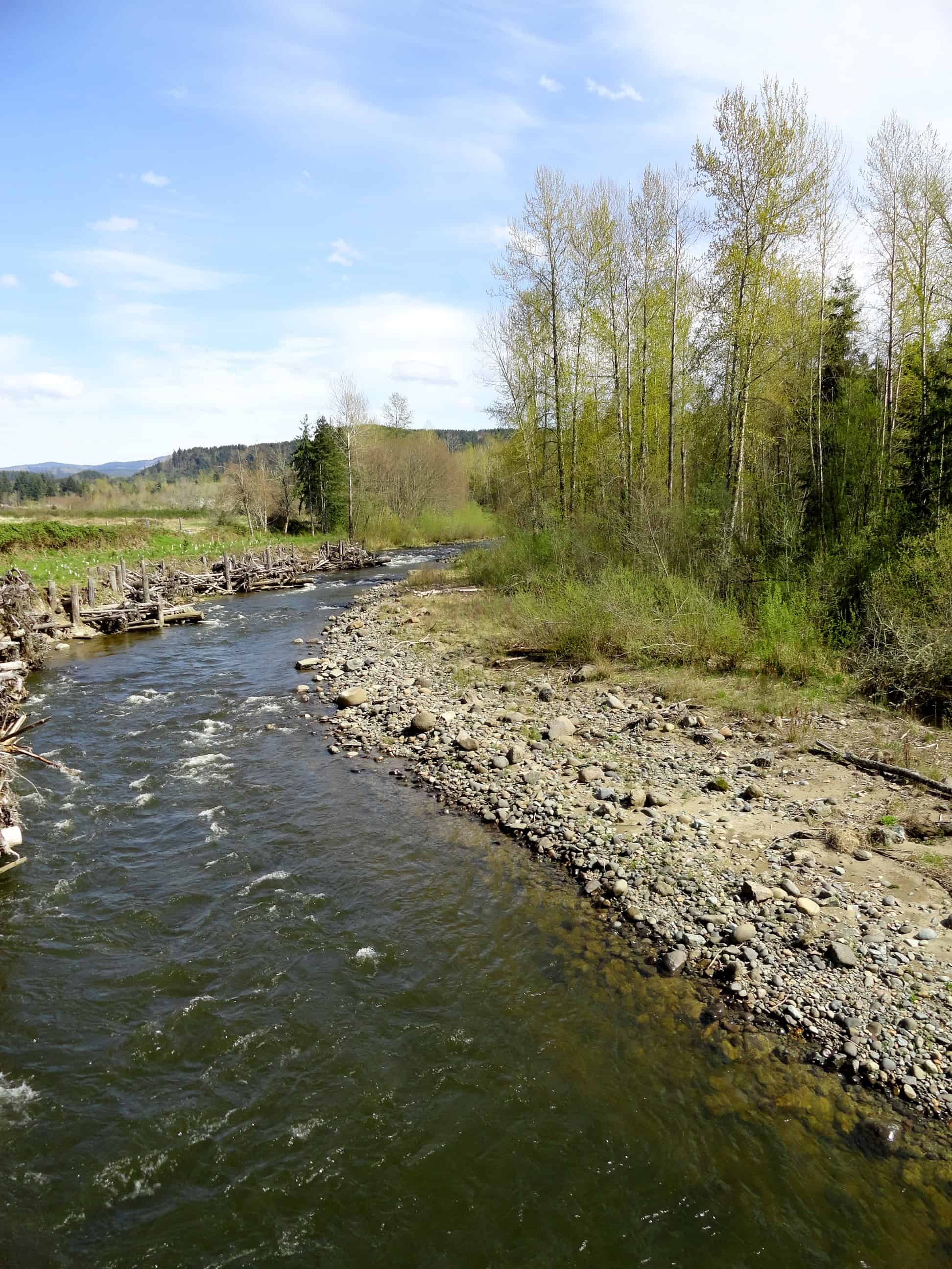 Now locate a trail heading left and take it immediately coming to an overlook of the Mashel River. Take a few minutes to read the interpretive sign on this river, an important salmon-bearing tributary of the Nisqually River. The river here is going through a restoration project spearheaded by a consortium of groups including the Nisqually Land Trust, Nisqually Indian Tribe, Pierce County Conservation District and the Town Of Eatonville. They have been creating new log-jams, removing invasive species, and improving riparian habitat to help salmon stocks recover. The restored river will be the centerpiece of a new trail system that the town is currently working on. Funding has been secured for a new hiker-only bridge over the river connecting the parks and for the Bud Blancher Trail which will connect the town to the Pack Forest.