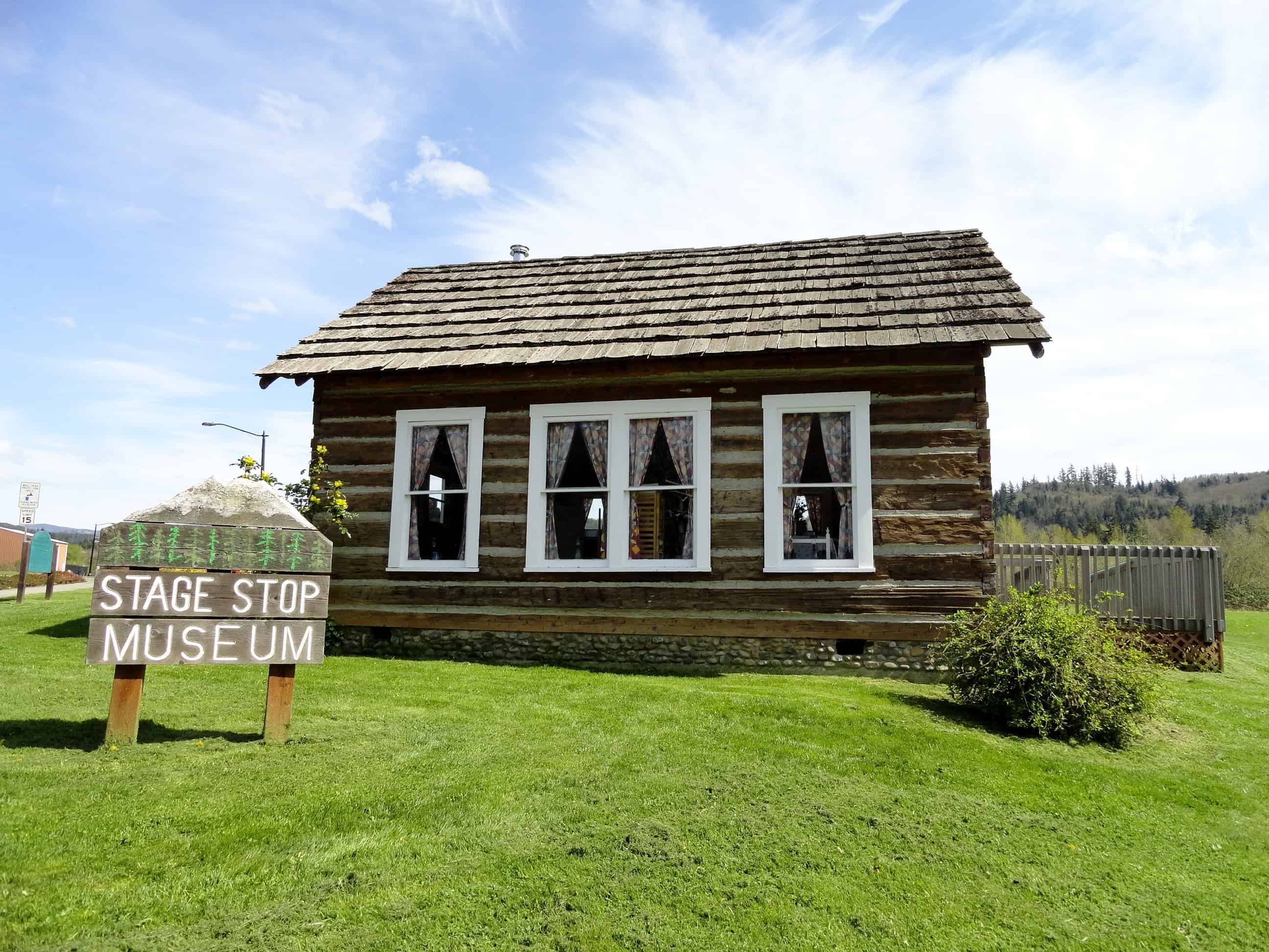 Before starting your walk at Millpond Park, check out the little log cabin to the west of the pathway. This structure was the first home in Eatonville, built by town founder Thomas Cobb Van Eaton who arrived from Minnesota in 1889. Van Eaton lived in the back of the home with his wife and three children, while the front of the structure was used as a trading post, stage stop, and post office. This is not the original location of the cabin, however. It was moved here in 1996 where it was restored and continues to be run as the Stage Stop Museum by the Eatonville Historical Society. It’s open for visitors from 1-4 on Sundays, Memorial Day through Labor Day. Feel free however to walk around it anytime.
