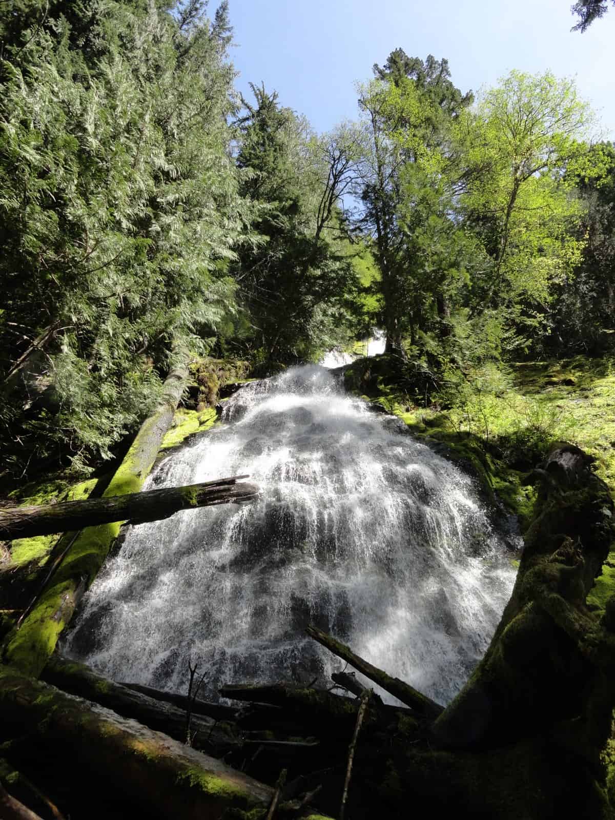 As you gain elevation, the surroundings begin to change. You encounter more rock covered in thick, luxurious moss, lots of vine maple and giant old growth trees. The trail becomes a series of switchbacks between the two rock walls, with the Dalles Creek as your constant companion. There is a short spur trail to a beautiful waterfall and a couple of huge cedars that we fondly call “The Twins”. A few more switchbacks later you encounter a log stairway, which is then followed by yet more switchbacks until finally, you come to the last and more level part of trail. Here you find yourself back in second growth forest once again.