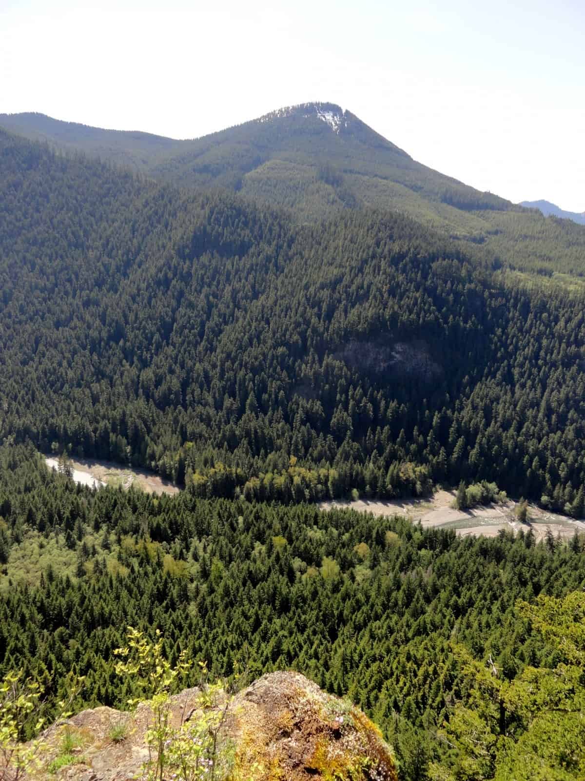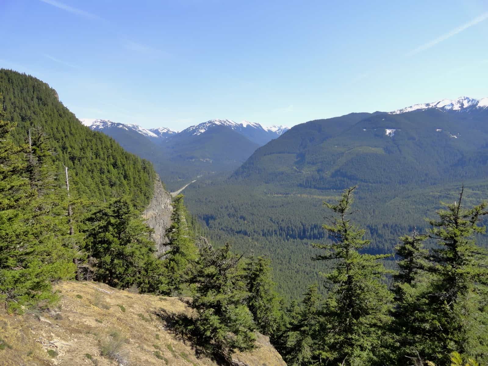 The entire trail to this point is under the cover of the forest. At approximately 2.4 miles from the trailhead you emerge into the light on a rocky point at the top of the Palisades Cliffs. From here you have an incredible view of the White River Valley spread out in front of you, 1,100 feet below. This is a great spot for lunch.