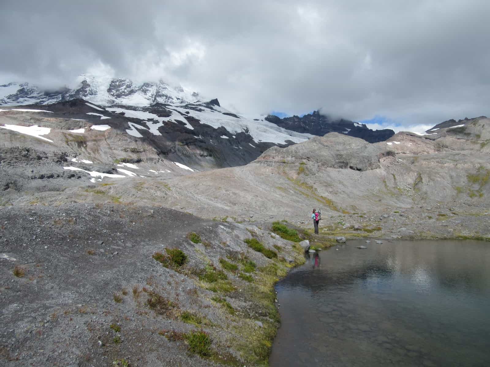 The trail marches north skirting below a small knob before brushing up against a sparkling little tarn that often reflects Rainier. You’ll want to spend some time here trying to capture a few choice photographs. Then continue hiking on a rockier path across and along polished ledge and glacial till. This entire area was under a sheet of glacial ice not that long ago. Look around for tenacious marmots scampering about colonizing plants in search of some good grazing. Look right at the plummeting glacier-fed Stevens Creek now just a couple of hundred feet away.