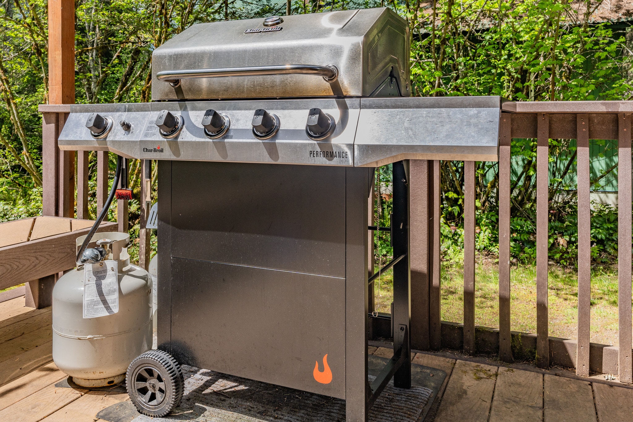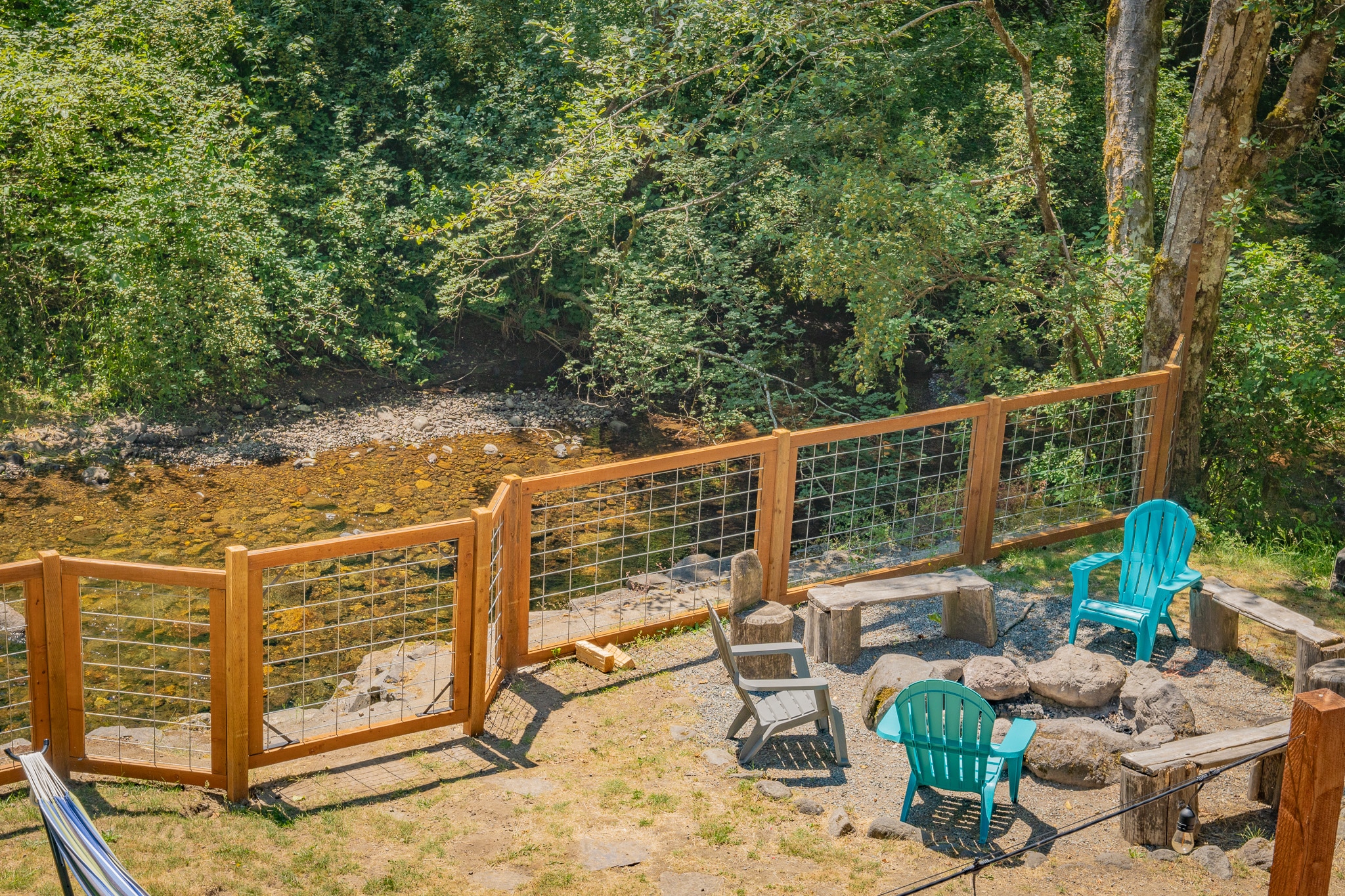 Big Creek flows right in the backyard, offering a soothing backdrop to your stay. Savor the view from the balcony, roast marshmallows around the fire pit, or unwind in the 8-person hot tub. The outdoor space includes a hammock, BBQ grill, and cornhole for endless enjoyment.