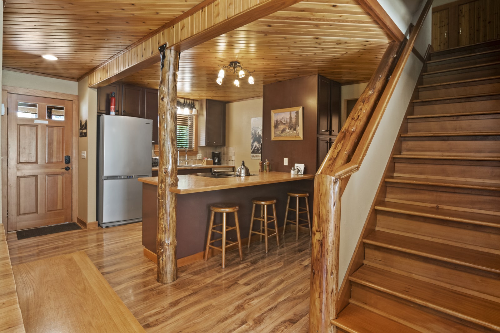 - Upstairs: Two king bedrooms, one with a private balcony overlooking Big Creek.
