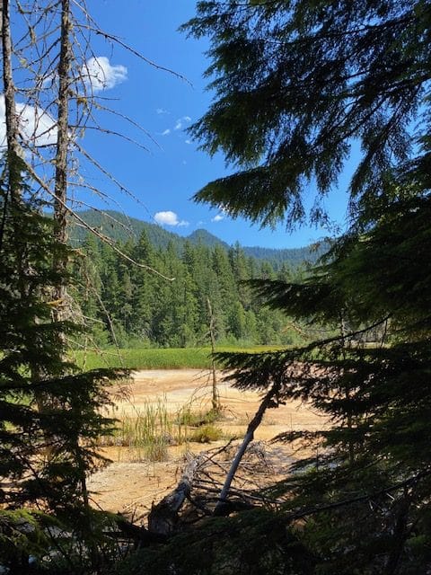 Next, you’ll pass Soda Springs (right), another mineral spring enclosed by a ring of stones which is shortly followed by a view of beaver ponds (left) though according to the interpretive sign the beavers haven’t been seen for a while.