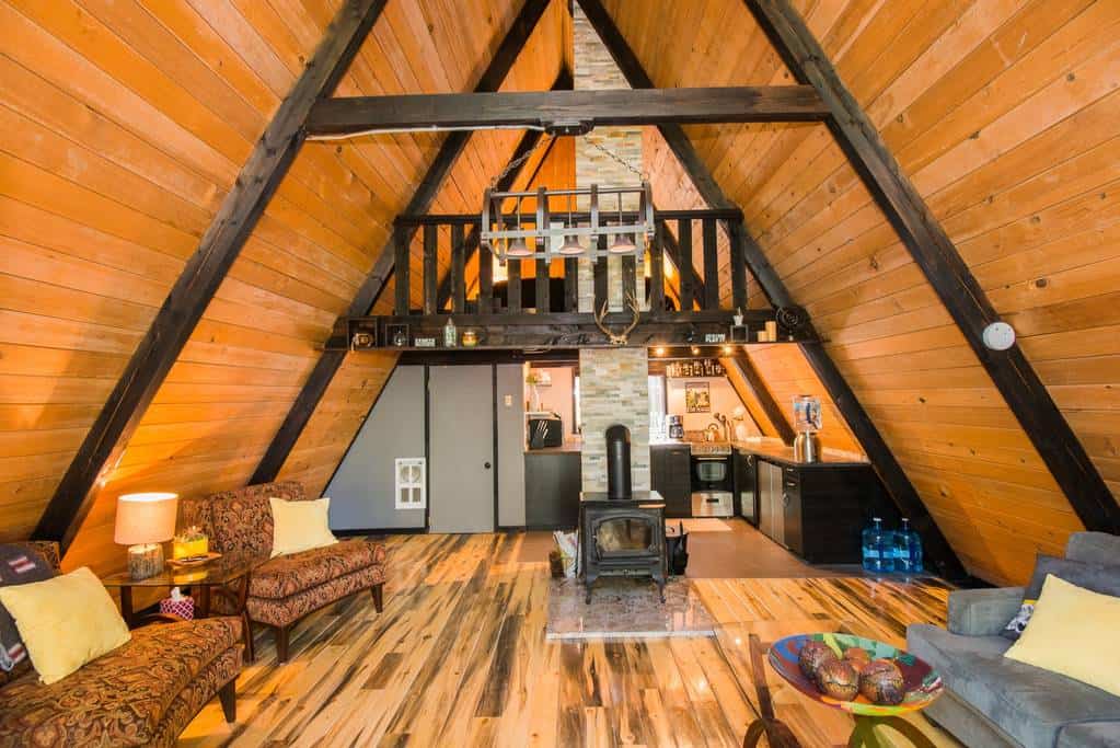 This quaint A-frame was originally built in 1965 and recently remodeled in 2016. This 700 square foot vacation rental is both rustic and modern. The interior is modern and comfortable. Guests can enjoy sitting next to the wood stove after a hike up in the national park, watch a movie & relax. Wifi provided. The kitchen is equipped with the basics, and even includes thoughtful touches like coffee, creamer, salt, pepper, and hot chocolate. The bedroom is a loft with access through a pull-down ladder. The bathroom and shower are both compact spaces. The cabin has a wood stove and outdoor fire pit. Firewood is not provided but the local store Suvers, in nearby Ashford has firewood for sale.